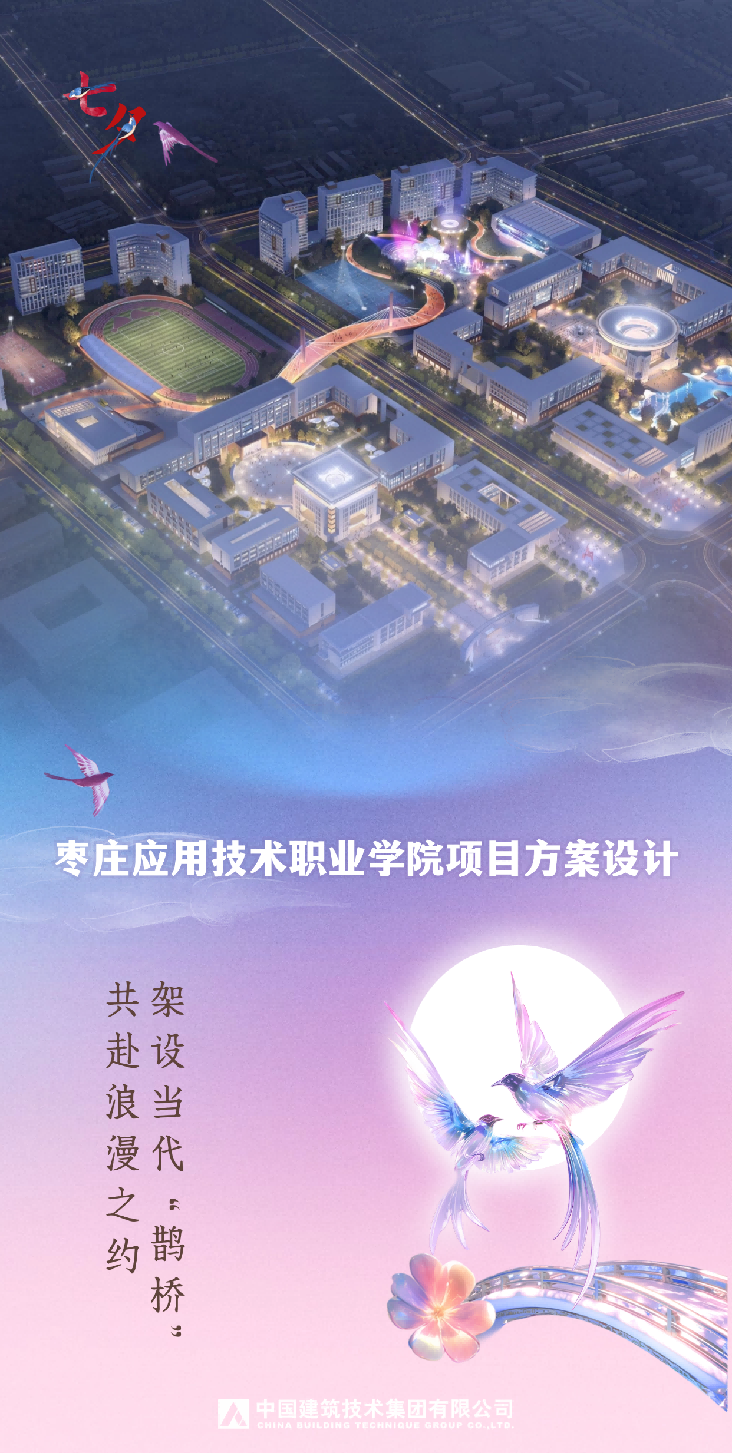 本项目位于枣庄市中心,总用地面积37公顷,地上建筑面积约40万平方米,地下建筑面积约5万平方米,容积率1.40。项目坚持规划引领,按“高宽大切”要求,打造“节能、智慧、人文、绿色”校园,彰显学校“现代化、人文化、国际化、生态化”理念。为丰富枣庄应用技术职业学院文化内涵,规划“如意”鹊桥,时空互联,旨在构建心灵桥梁,营造和谐校园,传递学院珍视师生情谊与未来愿景。