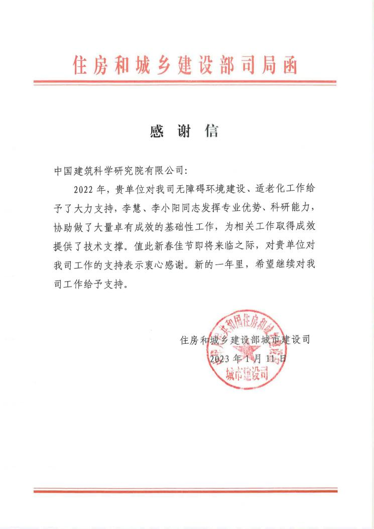 春节前夕,中国建研院收到住房和城乡建设部城市建设司发来的感谢信,对中国建研院在无障碍环境建设、适老化工作给予的大力支持,及有关同志发挥专业优势、科研能力和取得的成效上给予肯定并表示感谢,同时希望新的一年里对住建部城建司工作继续给予支持。