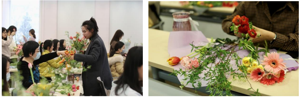 活动中,专业花艺老师为大家讲授了插花艺术的基本知识点,包括花材识别、插花技巧、色彩搭配、养护保存等重点内容,并现场演示了插花技艺。大家边听边学边动手,经过一番修剪配搭,一束束错落有致、别具特色的插画作品相继完成。