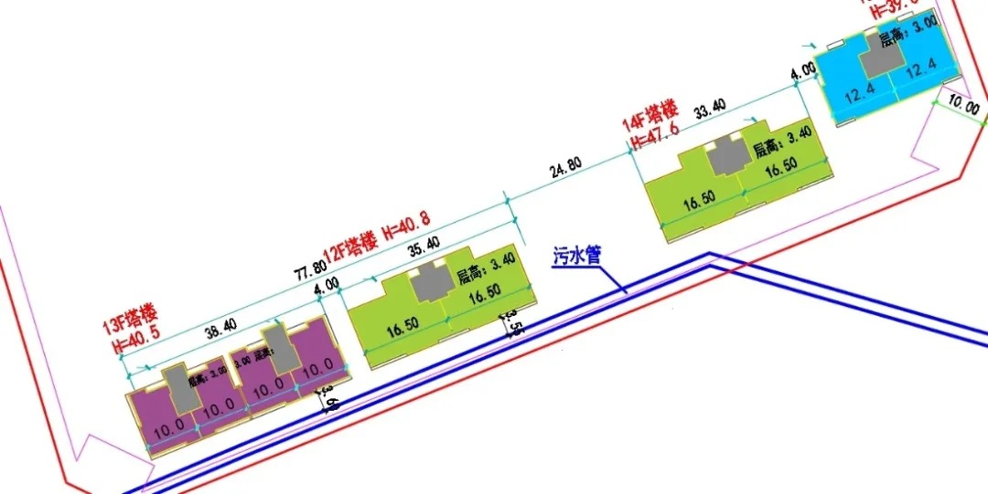 项目位于北京市海淀区东升镇,基坑面积约40664平方米,周长约803.65米。地块南侧既有西南至东北走向的污水、输水管线,其中管径2200毫米的水泥倒“L”形污水管(管顶埋深5米、管底埋深7.2米)与拟建建筑仅距3.55~3.60米,是基坑支护及管渠保护的关键难点。