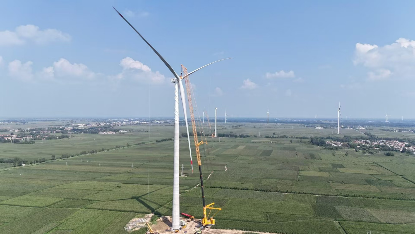 本风电项目建设规模50MW,包含4台GW-191-5000机型和5台GW-191-6000机型,采用钢混塔架结构,总高度160米,其中混凝土塔段高度约为112.6米,预应力体系采用直径15.2,极限强度标准值1860MPa的低松弛高强度无粘结钢绞线,搭配使用TENSAM15系列1860MPa级锚具,环向36孔布局,单孔10/11根,目前项目已发电并网,运行稳定。