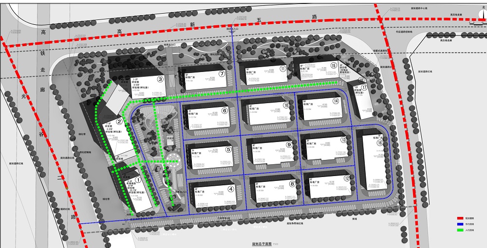 根据对场地周边环境及场地本身的特点,结合高新区规划局的规划设计要求,本方案分别在光谷二路及高新五路布置主要出入口,结合中心花园设计,通过南北、东西方向两条主要视觉景观轴线塑造园区良好的景观形象。从而打造高档建筑标准,优异的环境品质新型高端研发生产园区。建筑空间布局北高南低,在高新五路与光谷二路交叉口处设置两栋标志性25层孵化器研发大楼。沿高新五路设置9层研发车间,基地内部建筑层数高低错落,整个建筑群天际线变化丰富。